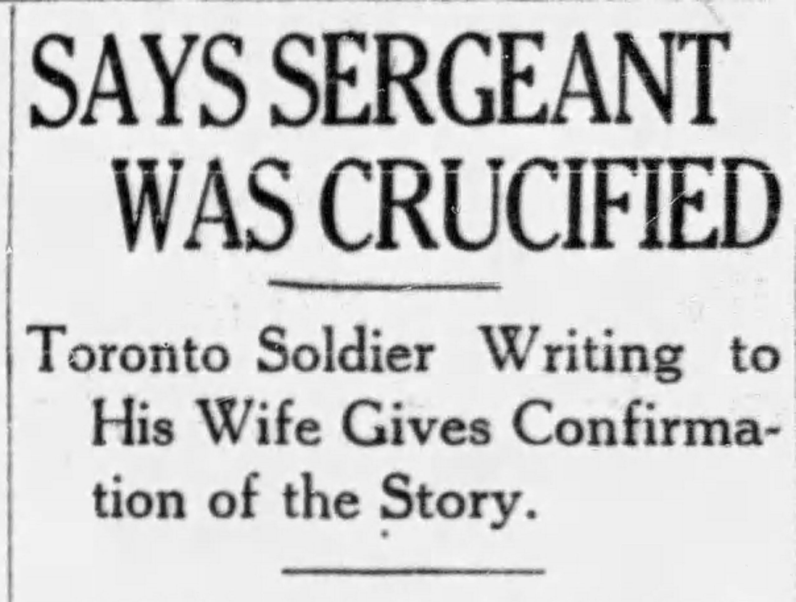 История распятого солдата также началась с сообщения английской газеты. 5 мая 1915 года лондонская The Morning Post опубликовала корреспонденцию, переданную неким подполковником. Он сообщал, что канадские военные вне себя от ярости, так как одного из их однополчан распяли немцы. И это не слух, за правдивость истории ручается генерал (его фамилия, как и фамилия подполковника в сообщении отсутствовала).
