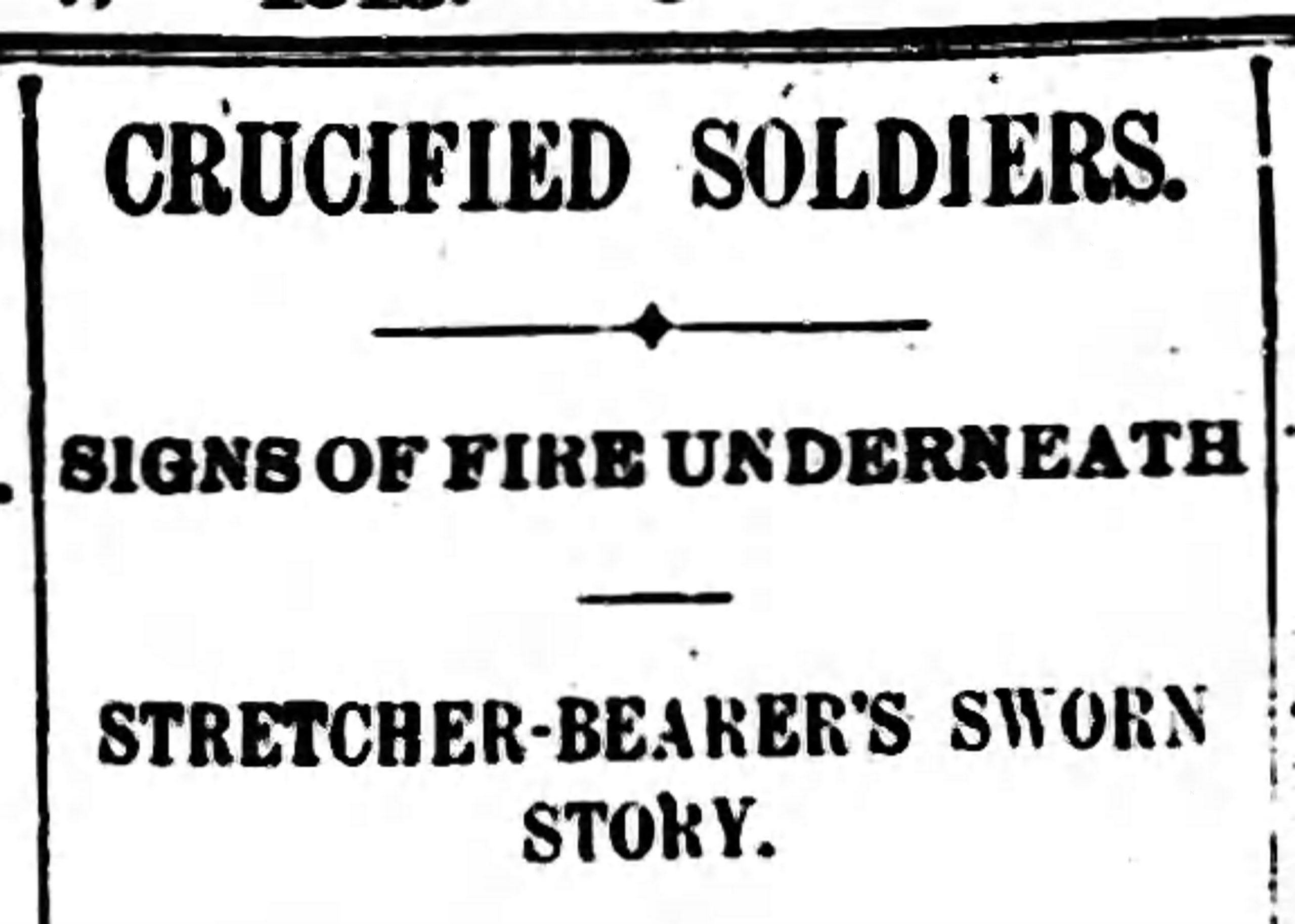 Газета Liverpool Daily Post and Liverpool Mercury 7 июня 1915 года опубликовала данные под присягой показания военного музыканта. Тот заявлял, что видел двух мертвых солдат, не из своего подразделения, распятых на стене амбара. Их руки были то ли прибиты к двери гвоздями, то ли приколоты штыками. Под одним из них, возможно, разводили костер.