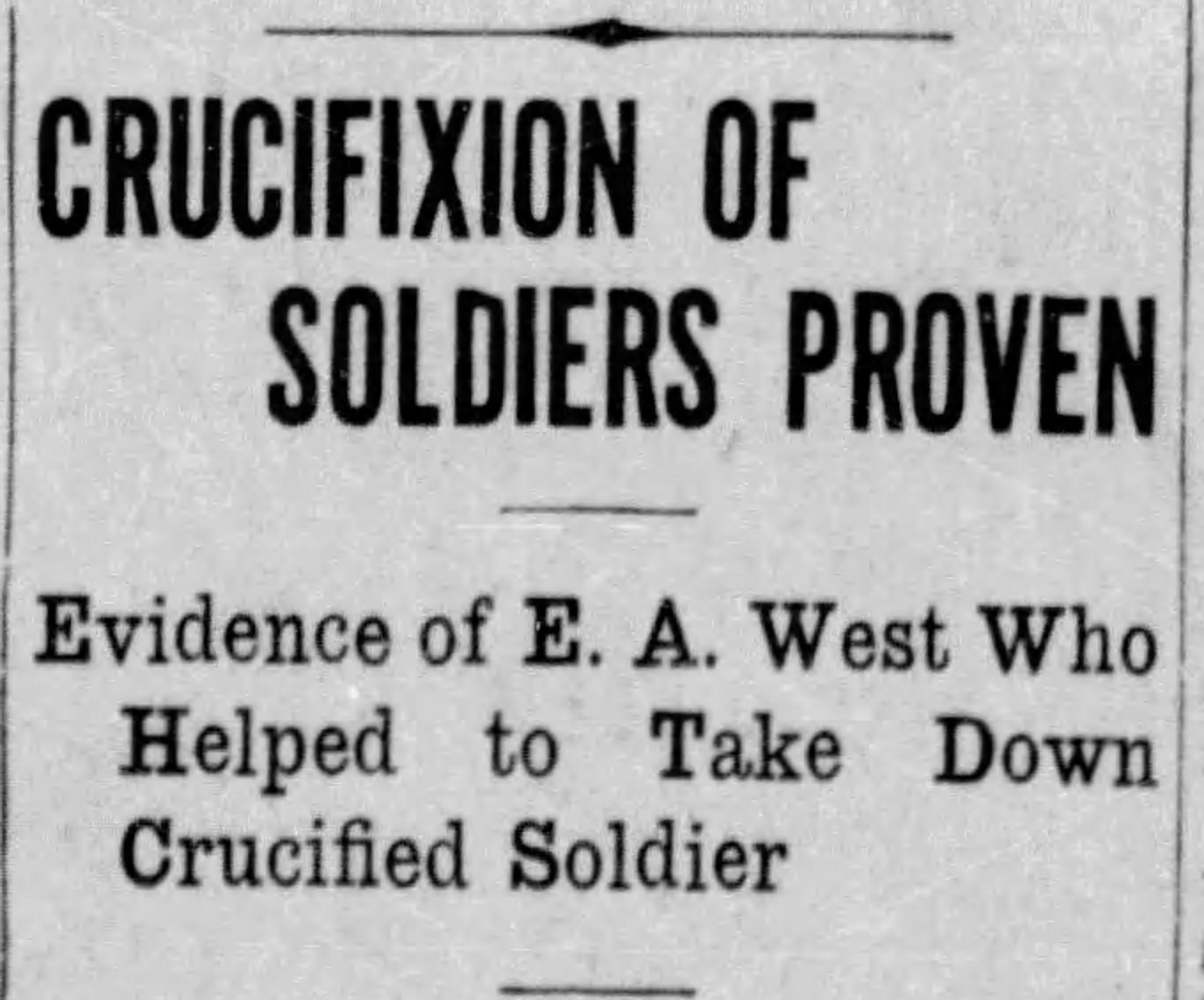 В июле некий И. А. Вест из 5-го батальона рассказал прессе, что лично снимал с двери сарая одного из распятых. Тело было обезображено до неузнаваемости 17 штыковыми ранами. «Тело было прибито к двери штыками, воткнутыми в руки, ноги и шею, более тошнотворного зрелища мне видеть не приходилось», — утверждал Вест.