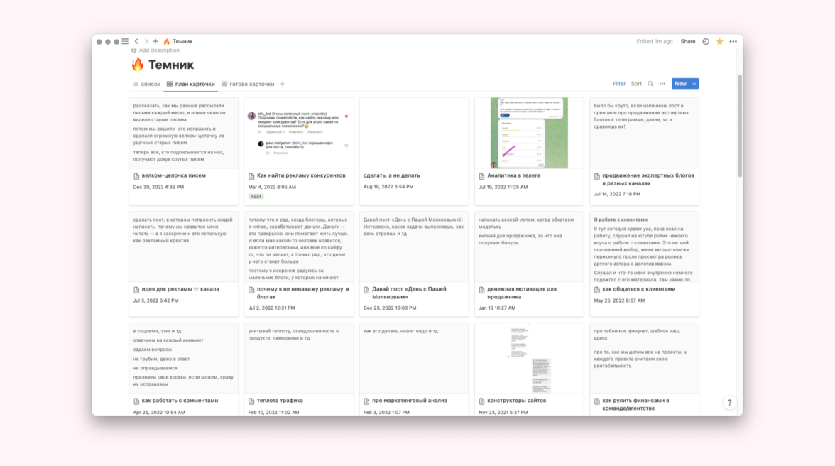 Поэтому вместо контент-плана я использую более гибкую систему — темник. Это список идей для постов, которые я хочу написать, без всяких там дат публикации.