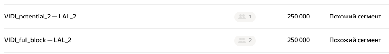 В этой группе LAL-аудитории создавались на 250 тысяч человек по двум сегментам вовлеченных. Директ прогнозировал 346 860 пользователей. Было важно, чтобы прогноз в данной группе не отставал в разы от предыдущей, ведь в такой ситуации гарантированно одна группа заберет на себя все показы.