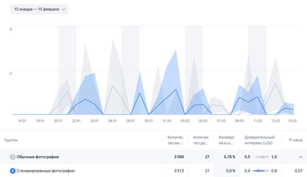 Мы сделали две версии одного лендинга: в одном были реальные фото подопечных, а в другом — созданные AI. Далее мы запустили рекламные кампании в ЯндексДирект, и переходящим по рекламе людям Varioqub случайным образом показывал либо версию с реальными фотографиями, либо версию со сгенерированными фотографиями. Тест длился месяц, и за это время каждый вариант страницы увидели по 3500 человек.