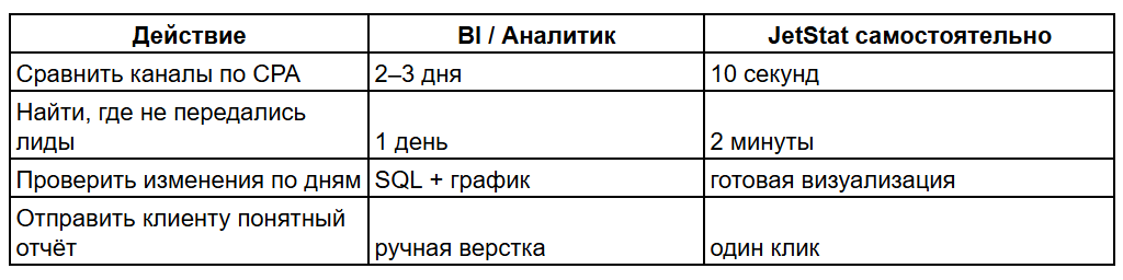 JetStat создан для этого. Особенно если вы — агентство или in-house маркетолог без отдельной data-команды.