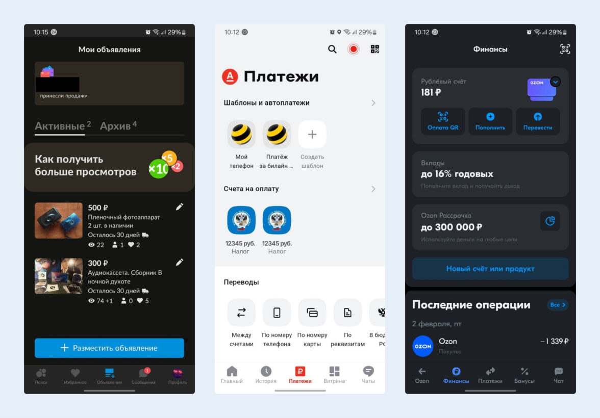 Мобильные версии «Авито», «Альфа-Банка» и «Озона»