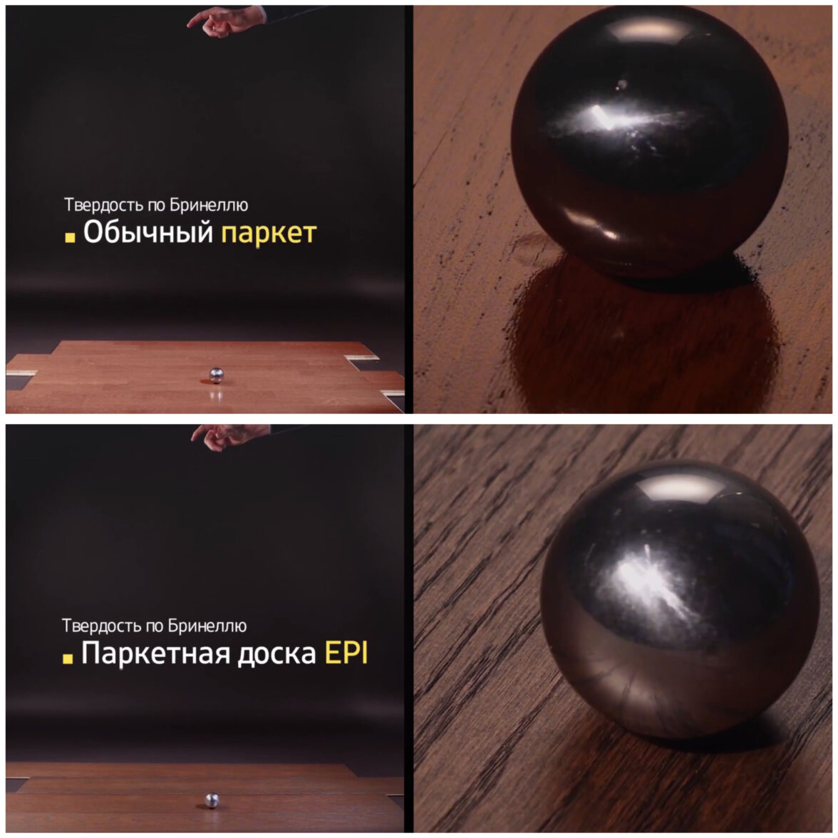 В студии. В условиях студийной съемки мы использовали черный фон, который стал визуальным акцентом для премиум-товара. Постановочная съемка позволила продемонстрировать физические свойства продукции, в том числе мы провели тест на твердость по Бринеллю, сравнив паркетную доску EPI с аналогами других брендов.