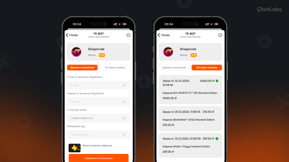В приложении для пользователя автоматически создаётся личный кабинет, который он сможет редактировать, например, сохранив e-mail, на который будут приходить чеки о покупках или пароль от аккаунта PlayStation. Также доступна возможность просмотра истории заказов.