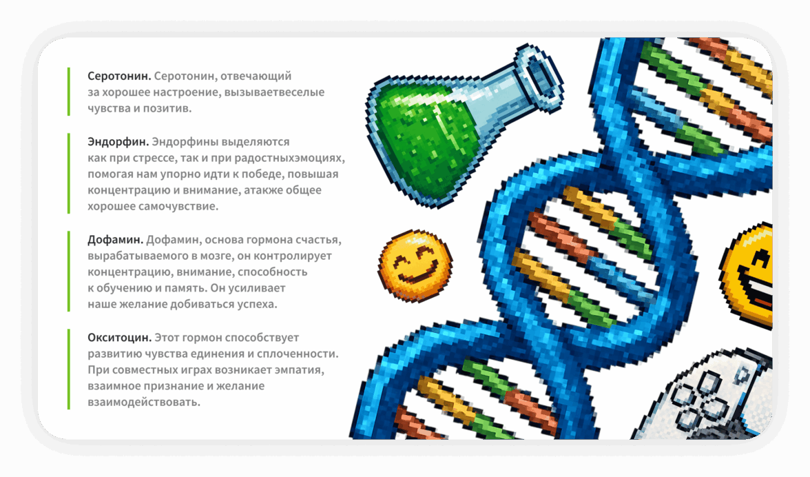 Игра естественным образом заставляет наш организм выделять гормоны хорошего самочувствия: дофамин, окситоцин, серотонин и эндорфины.