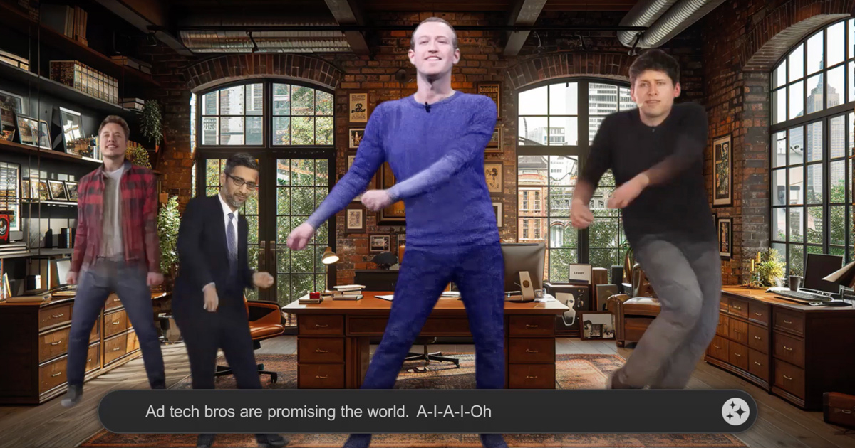 В другом тизере на запуск бота, который Publicis Groupe создала с помощью искусственного интеллекта, главы мировых бигтехов — Илон Маск, Марк Цукерберг и Сэм Альтман — с умным видом несут пургу об искусственном интеллекте. А потом танцуют вместе с Артуром Садуном под мотив песенки «У старого Макдональда была ферма».
