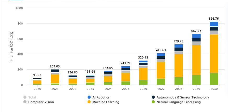 Объем мирового рынка инструментов искусственного интеллекта в 2023 году составил $136 млрд, по прогнозам, в 2030 году он достигнет $827 млрд.