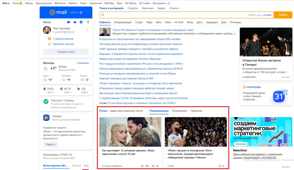 Рекомендательная лента занимает внушительную часть стартовой страницы поисковика Mail.ru и находится по центру экрана сразу после списка главных новостей. Опубликованные посты могут просматривать абсолютно все пользователи без необходимости предварительной регистрации в почте mail.ru. Умную ленту можно листать бесконечно, как с мобильного телефона, так и с компьютера. Кроме того, «Пульс» встроен в браузер «Атом» от VK.