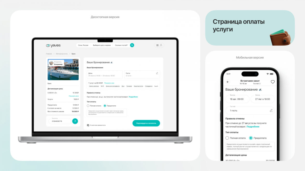 Здесь же реализовали систему холдирования. Пока судовладелец не подтвердит оплату, деньги будут заморожены Юкассой, и в случае отмены деньги вернутся обратно клиенту.