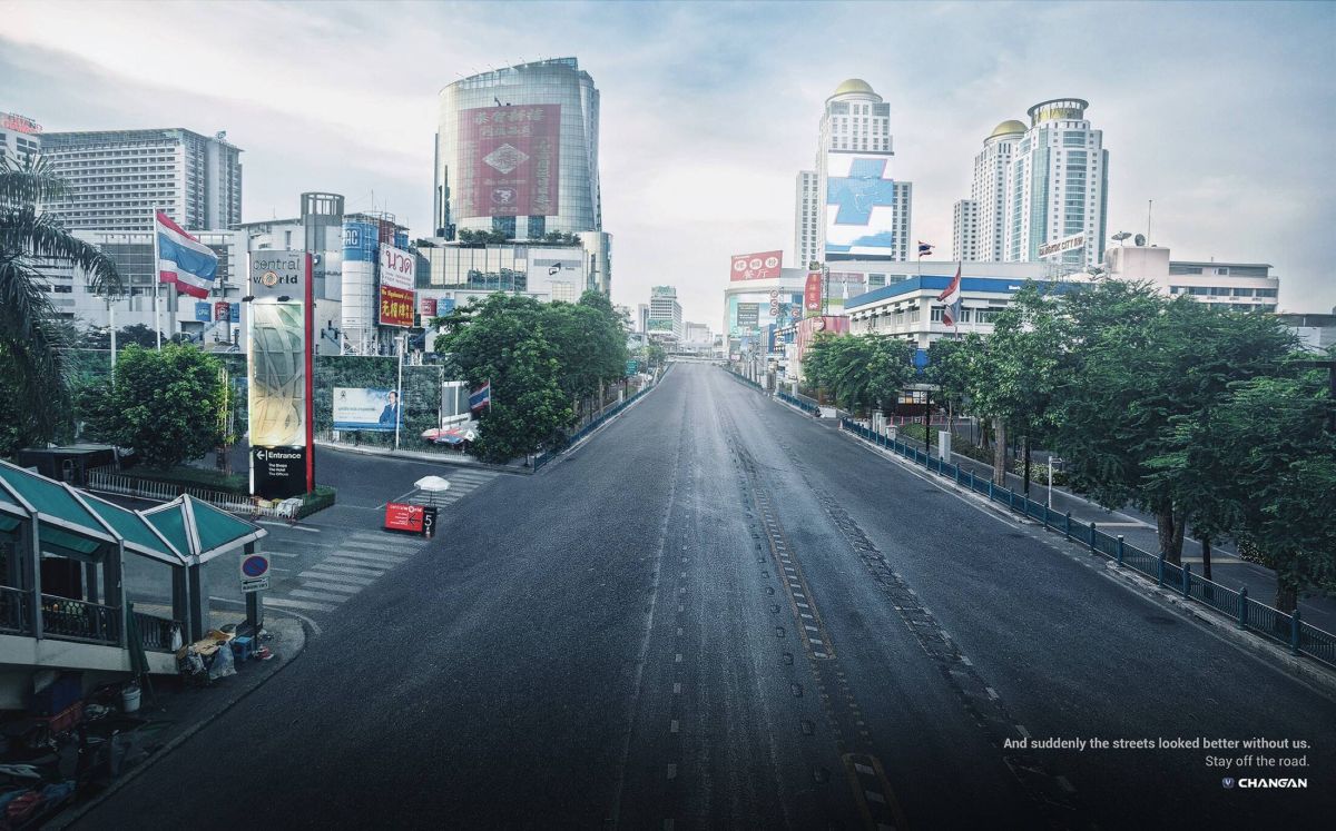 А вот интересная кампания Changan в Чили, также вышедшая во время пандемии коронавируса в 2020 году. В кампания Stay off the road Changan заявил, что сейчас улицы выглядят намного лучше без автомобилей.
