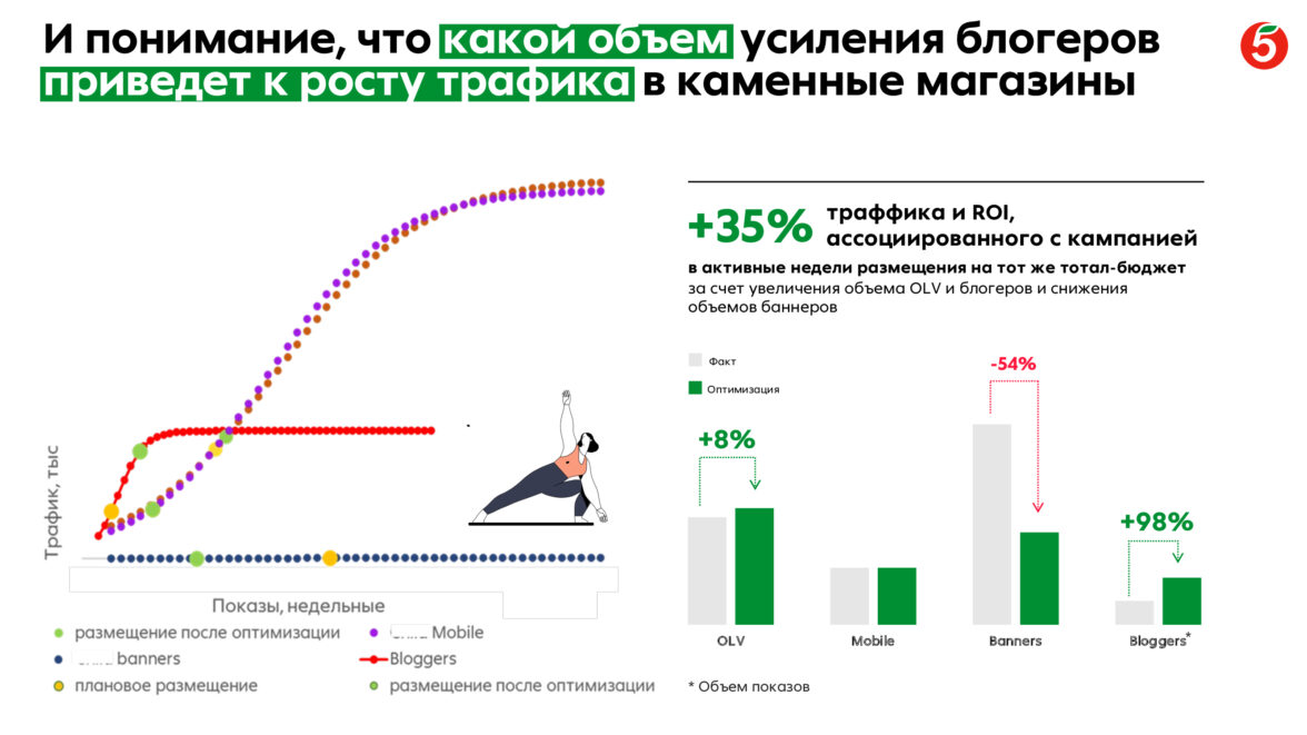 Проведена оптимизация кампаний «Пятёрочки»: например, для диджитал-кампании прирост трафика в торговые точки за счет эффективного перераспределения бюджета по каналам OLV, Баннеры, Блогеры составил +35% по сравнению с базовым сценарием.