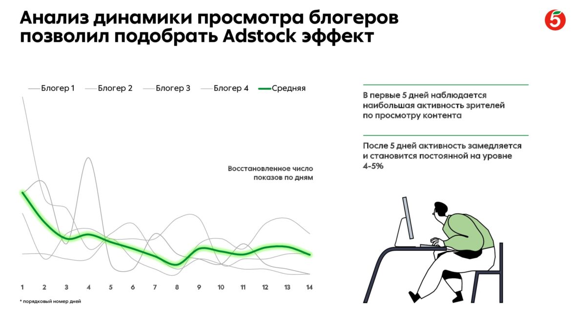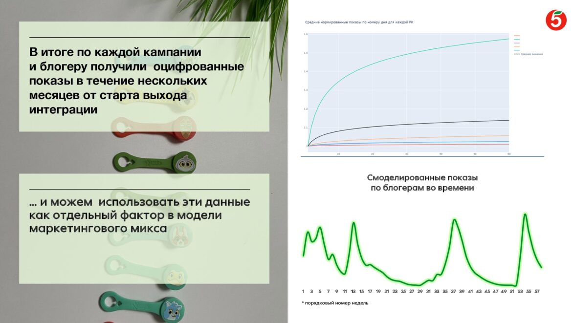 Команда проекта разработала несколько решений: ответом на первую проблему была оценка блогеров в совокупности с остальными каналами коммуникации «Пятёрочки» через эконометрическую модель маркетингового микса. Ответом же на вторую проблему стала технологическая разработка, позволяющая восстановить ретро-данные по просмотрам рекламных интеграций у блогеров в динамике с гранулярностью до дней — необходимой для интеграции в эконометрическую модель.