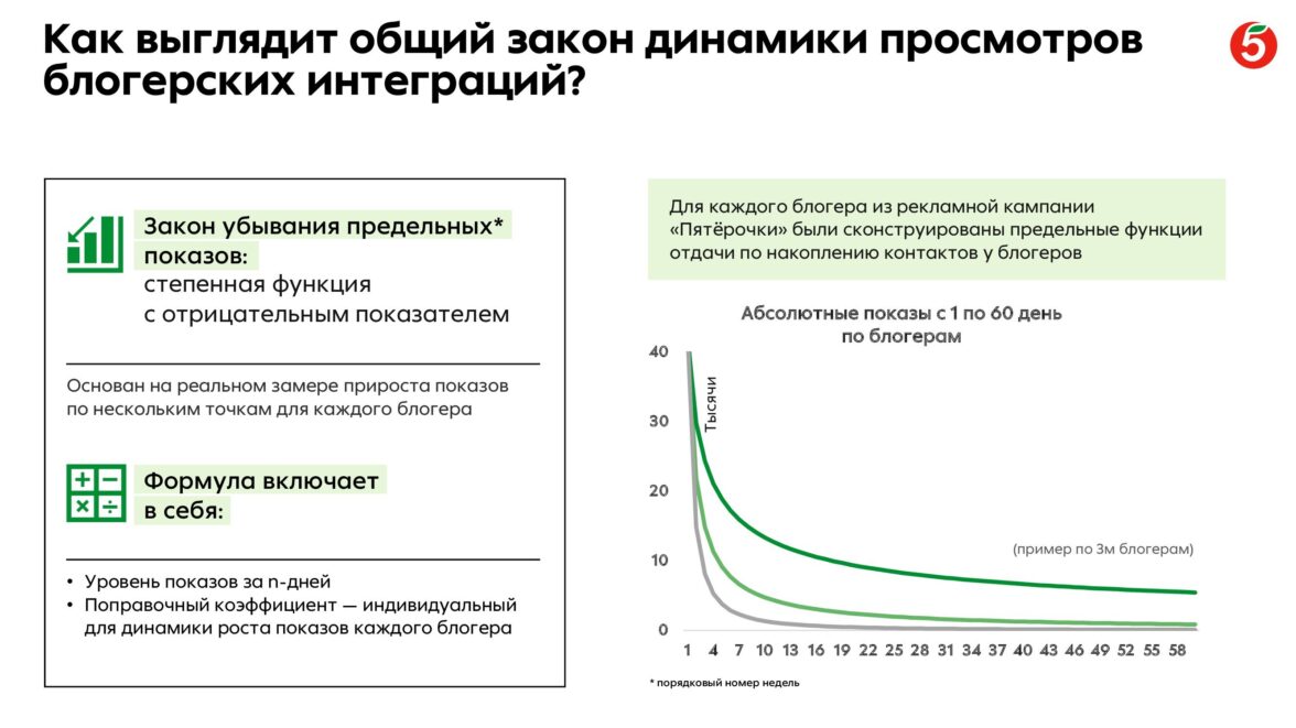 Шаг 3: используя этот закон, восстановили прошлые данные по блогерам в ретроспективе и получили массив для корректной оценки влияния интеграций на KPI «Пятёрочки».