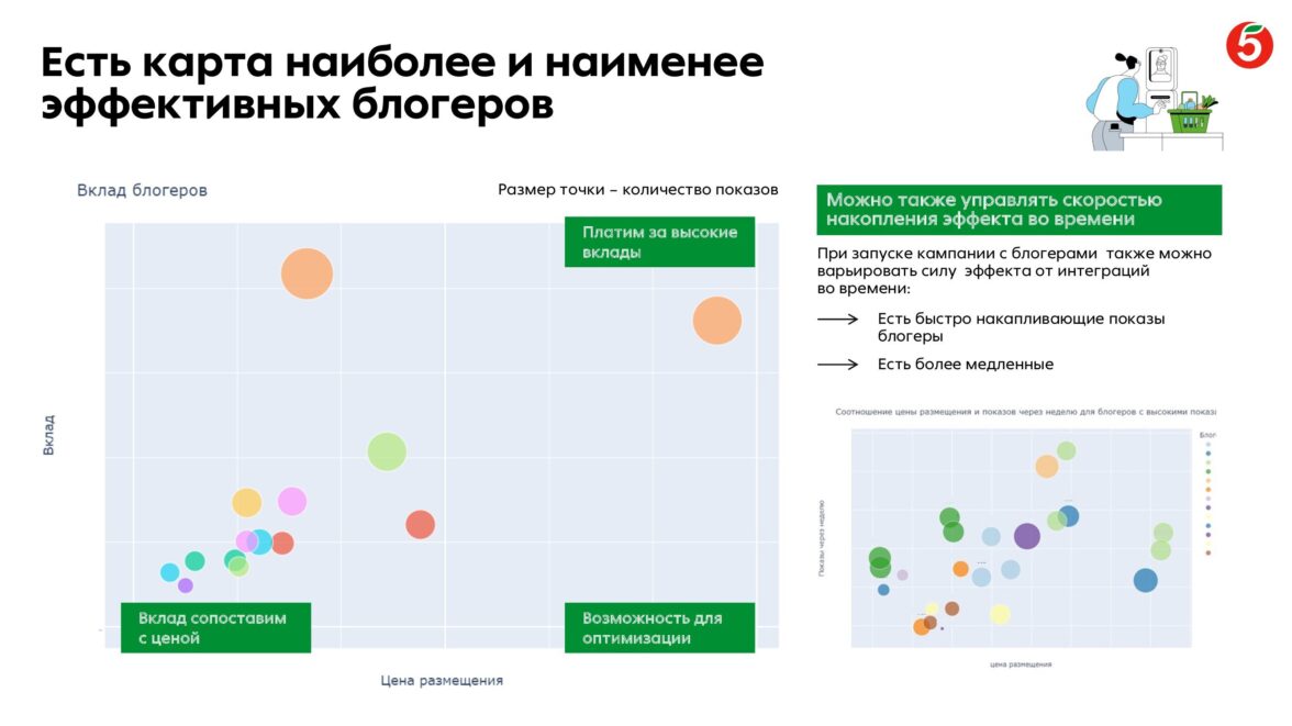 Определены наиболее и наименее эффективные блогеры по влиянию на трафик в офлайн-точки «Пятёрочки», что позволяет сбалансировать выбор для максимизации KPI.