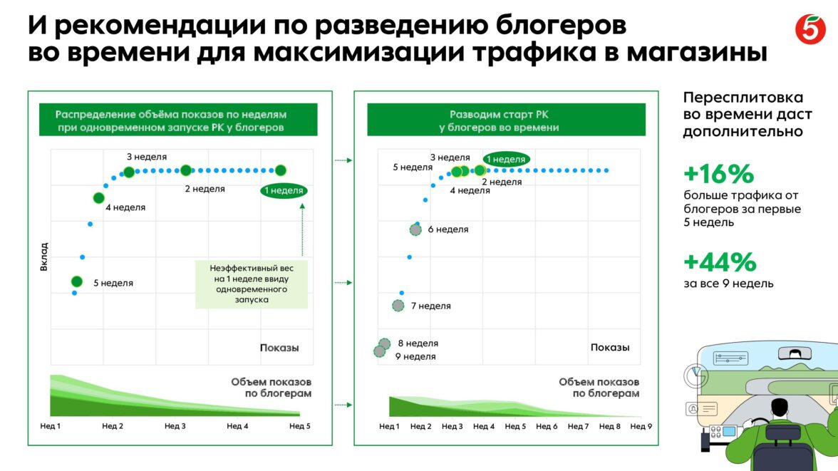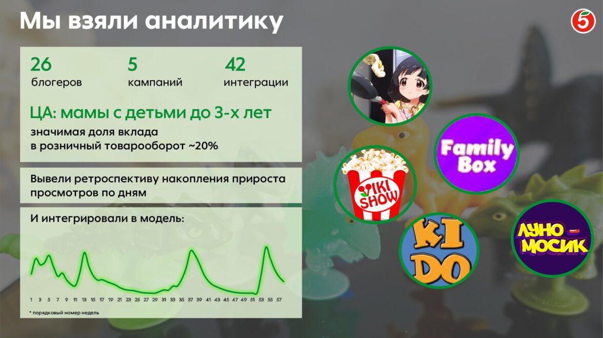 Динамика показов сообщения целевой аудитории была агрегирована в единый динамический ряд. Подход позволил оценить эффективность проектов с инфлюенсерами внутри всей системы маркетинговых коммуникацийа и измерить их влияние на трафик в «каменные» магазины «Пятёрочки».