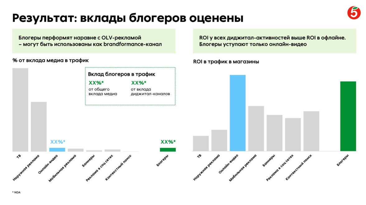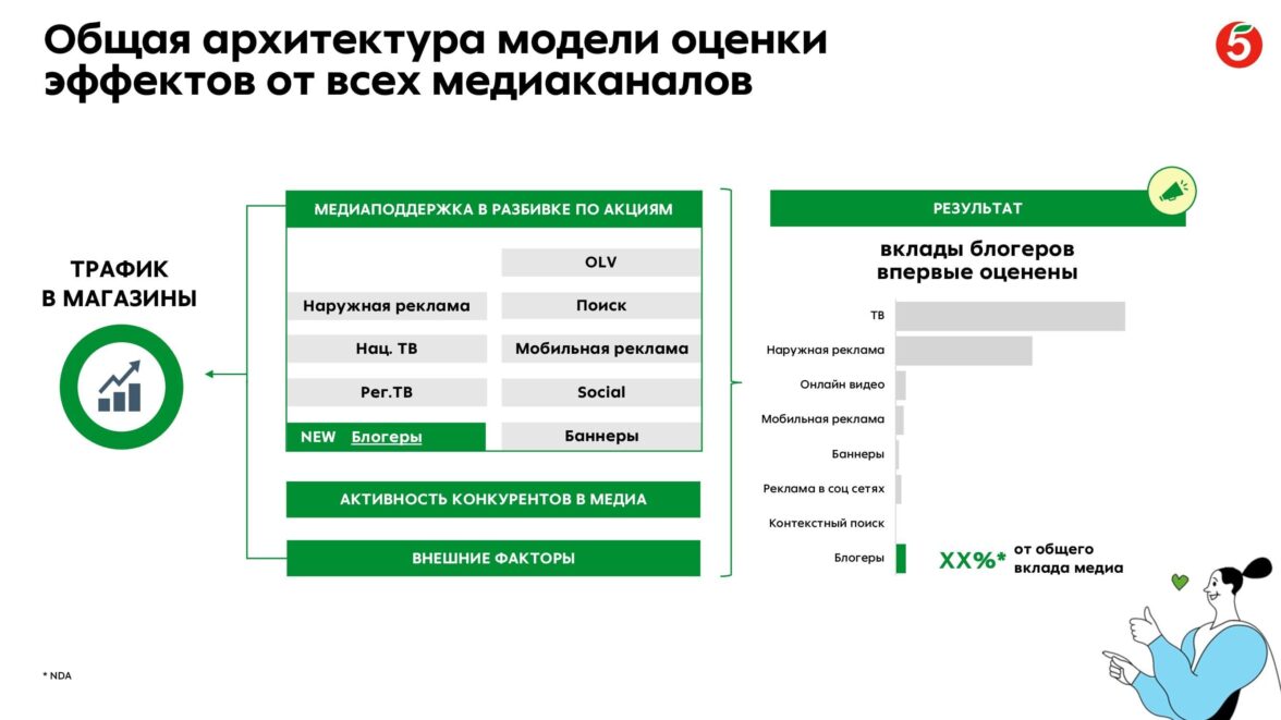 «Пятёрочка» — крупнейшая российская сеть продуктовых магазинов «у дома», которая насчитывает уже более 23 тысяч магазинов по всей стране — от Калининграда до Владивостока. Сеть ежедневно обслуживает свыше 18 млн покупателей по всей стране и собирает большой массив пользовательских данных. Для сохранения лидерских позиций на рынке бренду необходимо четко понимать, как работает то или иное медиа на ключевые бизнес-задачи. Важно отметить, что ритейлер имеет собственную единую панель для оценки эффективности медиа и коммуникации. Но если проанализировать эффективность ТВ и Digital относительно просто за счет большого количества доступных инструментов мониторинга, то оценить влияние нишевых каналов на реальные бизнес-показатели гораздо сложнее. Так, например, существует проблематика замера контактов и накопления охвата у блогерских интеграций.
