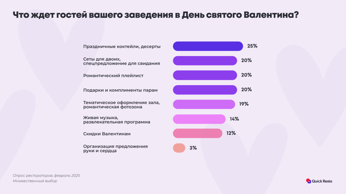71% рестораторов основательно подготовились к Дню святого Валентина, а 29% сделали ставку на публику, отрицающую праздник — таковы данные исследования Quick Resto. Большинство участников опроса уверено: в ресторане в этот день все должно быть прекрасно: и меню (25%), и спецпредложения (20%), и музыка (14%), и романтический антураж (19%).