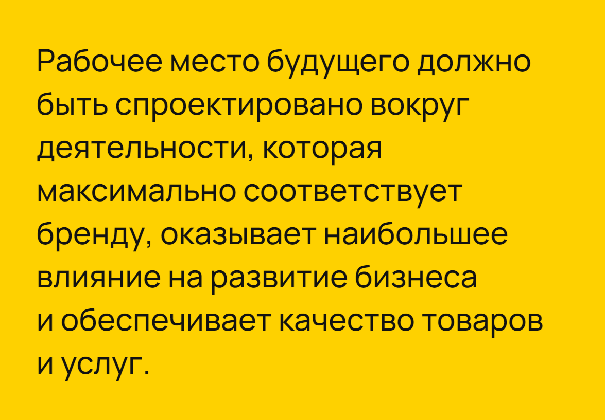 Рабочие места — и удаленные, и в физическом офисе — должны быстро реагировать на темпы развития бизнеса и улучшения продукта, адаптироваться к жизни сотрудников и людей, которые покупают продукты компании. Нет универсального темпа развития бизнеса, как и нет рабочего места, которое подходит всем — оно будет постоянно изменяться. И мы должны использовать наш бренд как ориентир, чтобы переосмыслить то, как мы работаем и что ценим: поведение, которое мы постоянно демонстрируем, принципы, которыми мы руководствуемся в работе и которым следуют наши сотрудники, чтобы достичь максимального успеха.