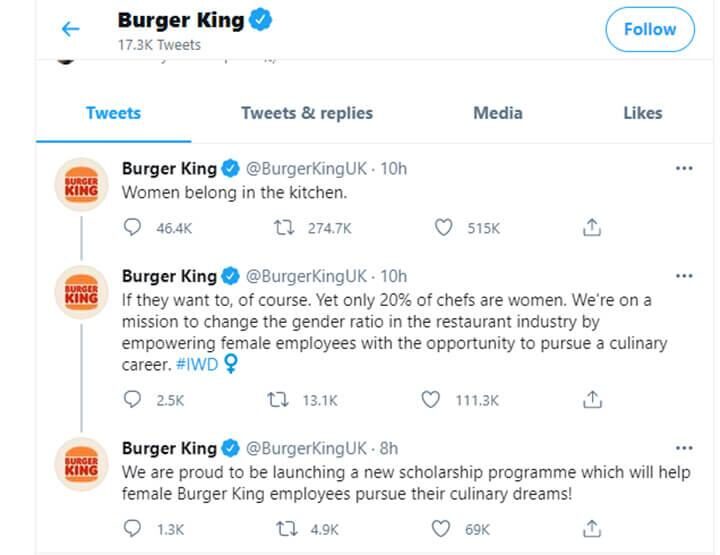 На 8 марта 2021 года британское подразделение Burger King опубликовало в Твиттере ветку обсуждений, первый твит в которой гласил: «Место женщины на кухне». За ним последовали еще два твита. В одном из них было написано: «Только если они этого хотят», а в другом — объявление о новой стипендиальной программе, направленной на то, чтобы помочь женщинам получить образование в области кулинарии и сократить гендерный разрыв в ресторанном секторе.