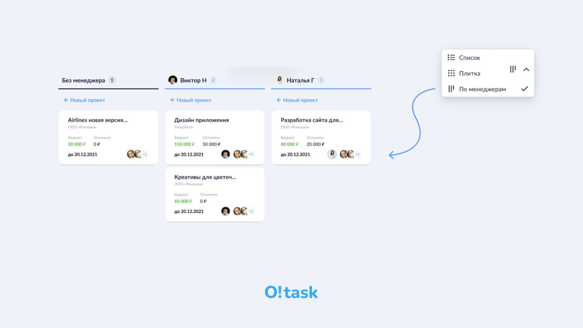 Знаем по себе, что видеть загрузку по менеджерам очень важно. Поэтому добавили опцию добавления менеджера на проект + добавили вид просмотра По менеджерам, чтобы было видно загрузку по каждому из них.