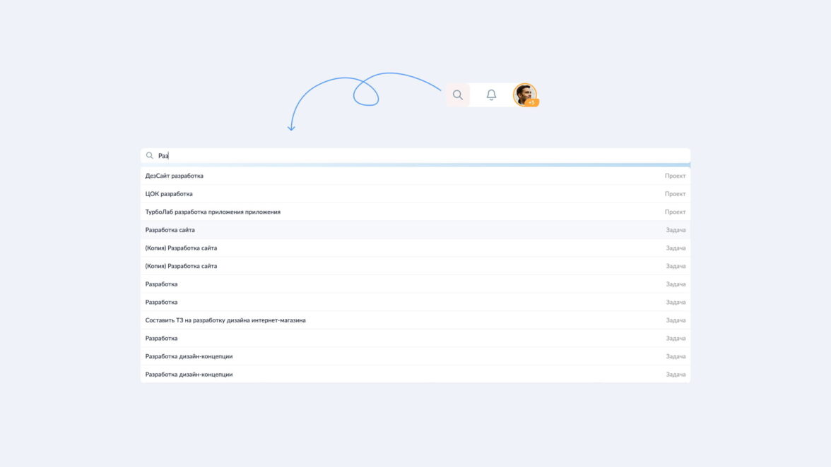 Теперь можно переходить к проектам и задачам из любого места в системе благодаря поиску. Расположили кнопку рядом с значком уведомлений справа наверху.Сейчас поиск осуществляется только по проектам и задачам. В будущем сделаем поиск по остальным сущностям (клиенты, файлы и другое).