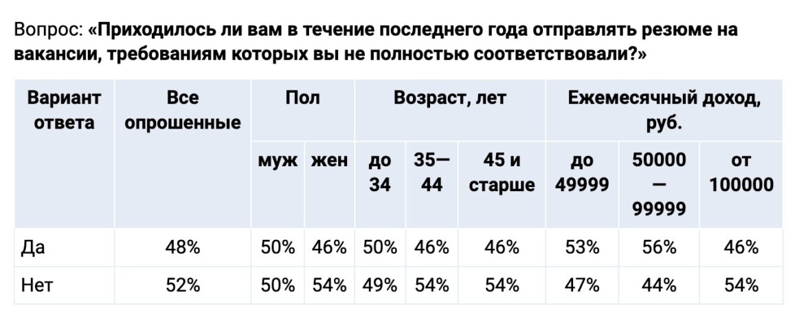 Сколько россиян отправляло резюме на вакансии, требованиям которых не полностью соответствовали.