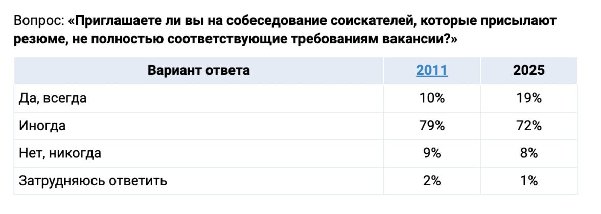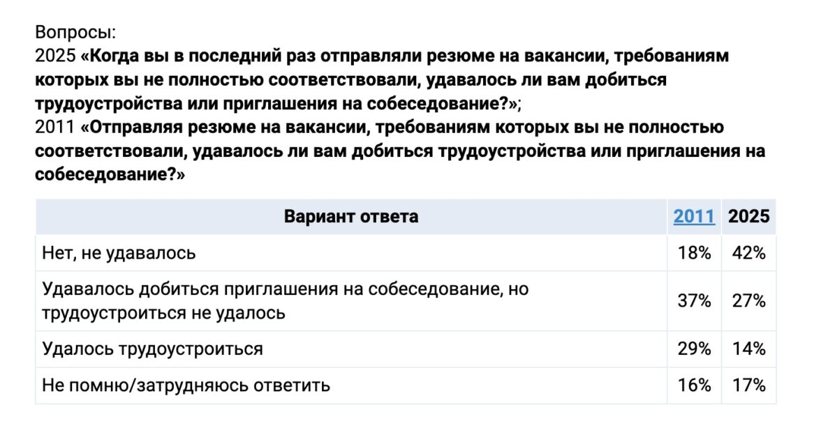 Если в 2011 году только каждому пятому (18%) кандидату с таким резюме не удавалось даже получить приглашение на собеседование, то в 2025 году работодатели не отреагировали на 42% подобных резюме. В 2011 году получил приглашение на собеседование, но не смог трудоустроиться каждый третий кандидат с «неполным» резюме — 37%. В 2025 году таких было 27%. Наконец, в 2011 году получал работу примерно каждый третий (29%) не полностью соответствующий требованиям вакансии соискатель, за последний год это удалось вдвое меньшему числу соискателей — 14%.