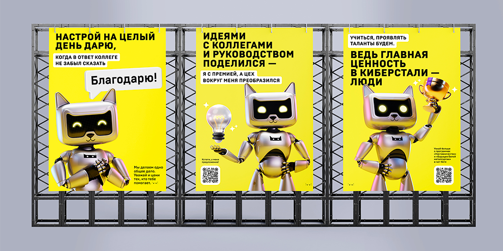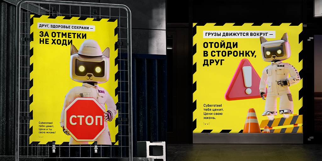 Киберкот должен был отобразить в бренде инновационность и дружелюбие. Маскот рассказывает о ценностях, погружает в корпоративную культуру и напоминает о безопасности на производстве. Зарифмованные сообщения привлекают внимание, не вызывая «баннерной слепоты» или раздражения.