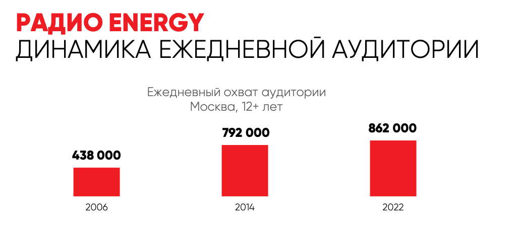 Радио ENERGY активно развивается как федеральный бренд, стабильно входит в ТОП-10 радиостанций России. Сегодня сеть насчитывает 161 передатчик, что позволяет охватить более 45 000 населенных пунктов — от Петрозаводска и Сочи до Петербурга и Камчатки, и уже свыше 4 млн человек ежедневно слушают лучшие мировые хиты, актуальные новости и интервью с топовыми артистами и диджеями планеты. Радио ENERGY — это баланс качественной зарубежной музыки CHR (Contemporary Hit Radio/Modern Rock), интерактива и профессиональных ведущих, проводник между современной музыкой и аудиторией. За 16 лет своей жизни этот бренд превратился из «модного тусовщика» в «осознанного трендсеттера», который формирует вкусы и направления в различных областях жизни слушателей поколения Y.
