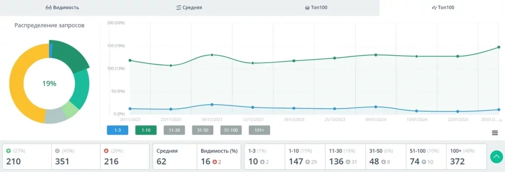 По итогам работ 2 месяца, уже после новогодних праздников, мы увидели рост позиций в ТОП-10 с 26% до 45% и в ТОП-3 с 3% до 7%.
