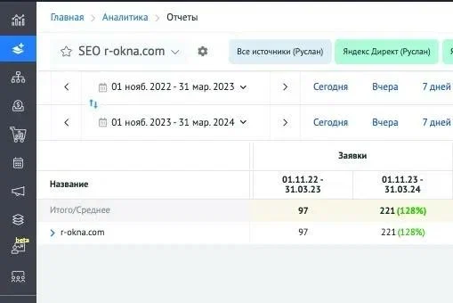 Количество лидов по данным Roistat за период с ноября 2023 по март 2024 увеличилось на 127%, по сравнению с периодом с ноября 2022 по март 2023 (сравнение периода прошлого года с тем же периодом текущего).