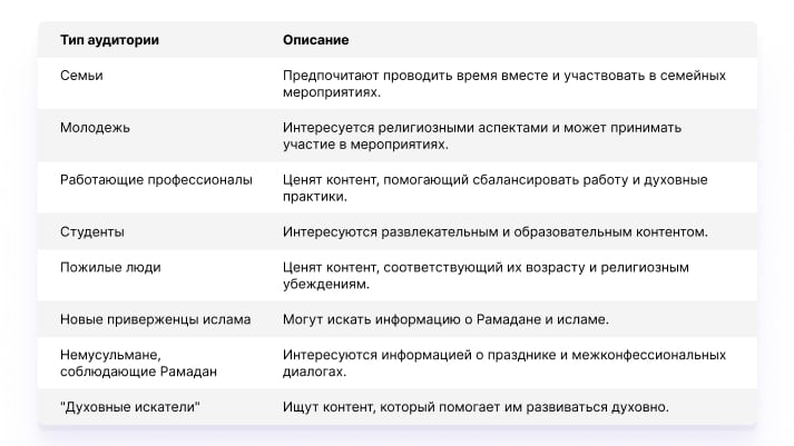 Молодежь: Интересуется религиозными и духовными аспектами Рамадана и может принимать участие в офлайн-мероприятиях.