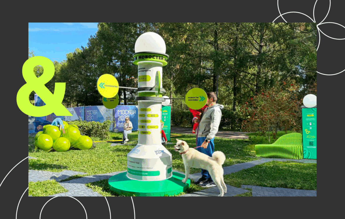 Внимание привлекал центральный элемент конструкции — навигационный столб с лампой-маяком. Он указывал путь к важнейшим темам будущего, о которых уже сегодня пишут СМИ Rambler&Co: новости Москвы («Мослента»), картина дня от искусственного интеллекта (портал «Рамблер»), технологии («Газета.Ru»), экология («Лента.ру») и спорт («Чемпионат»). Гости сканировали NFC-метки и QR-коды, чтобы читать подборки новостей от изданий, и отдыхали в зоне с параметрическими лавочками.