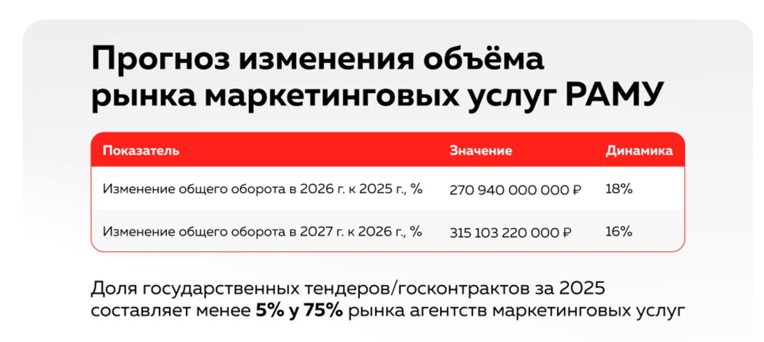 В 2026 году эксперты РАМУ ожидают роста рынка маркетинговых услуг на 18% — до 270,94 млрд рублей. По прогнозу на 2027 год рынок маркетинговых коммуникаций превысит 315 млрд рублей (+16%).