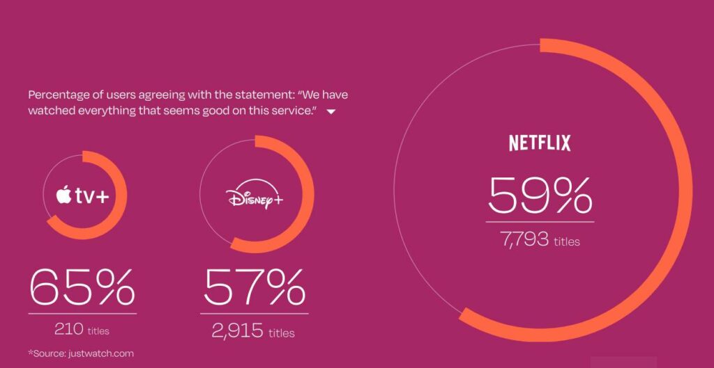 На Netflix сейчас представлено около 3 тыс. единиц контента, на Apple TV+ лишь 210 наименований, на Disney+ — более 6 тыс.