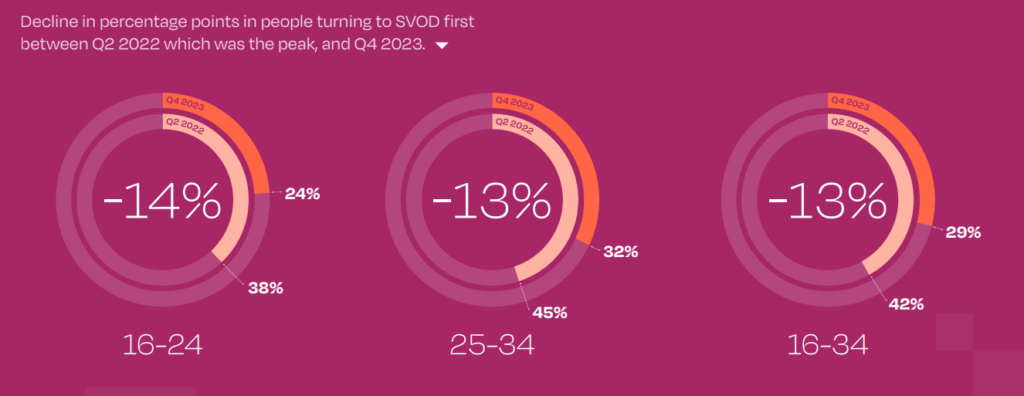 Исследования консалтинговой компании ScreenThink показали: доля британских телезрителей, которые ищут контент в первую очередь на SVoD-сервисах, сократилась на 13 п.п. за полтора года. Если во втором квартале 2022 года 45% потребителей в возрасте от 25 до 34 лет отдавали предпочтение подписным видеосервисам, то в четвертом квартале 2023 года этот показатель снизился до 32%. Среди зумеров (16-24 года) доля еще ниже: 38% было в 2022 году и 24% в 2023-м.