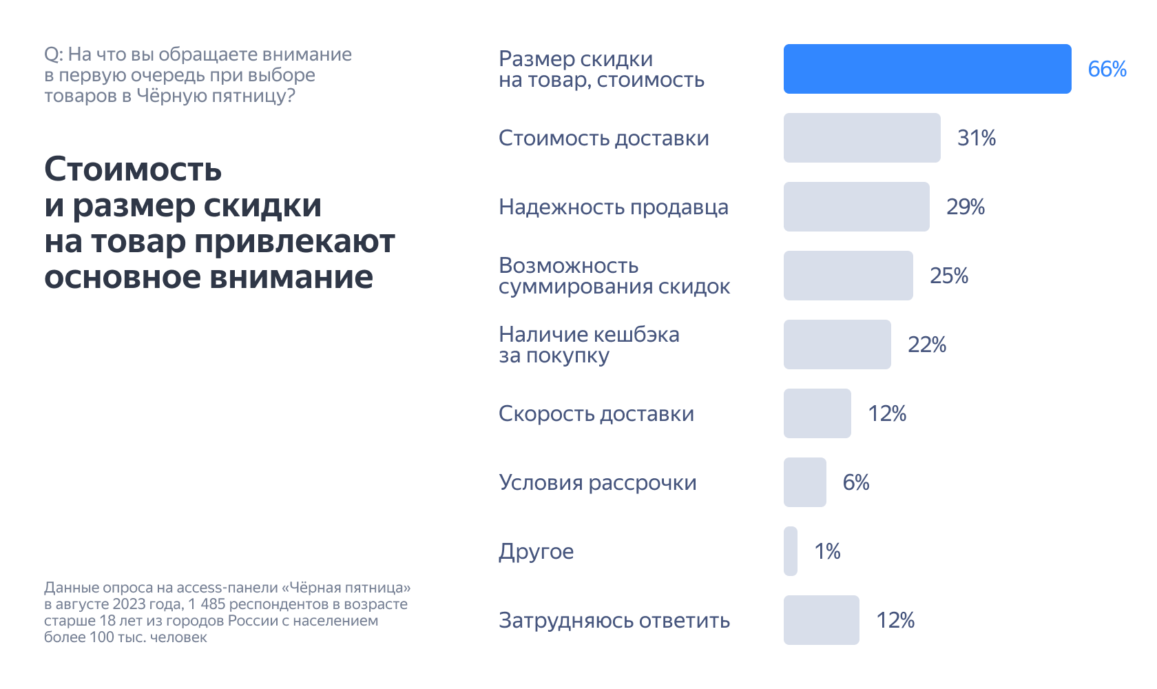 Самым главным критерием при выборе товара в «черную пятницу» остается размер скидки на товар, его стоимость. Так считают 66% опрошенных. На втором месте стоимость доставки (31%). Для 29% респондентов самым важным надежность продавца.