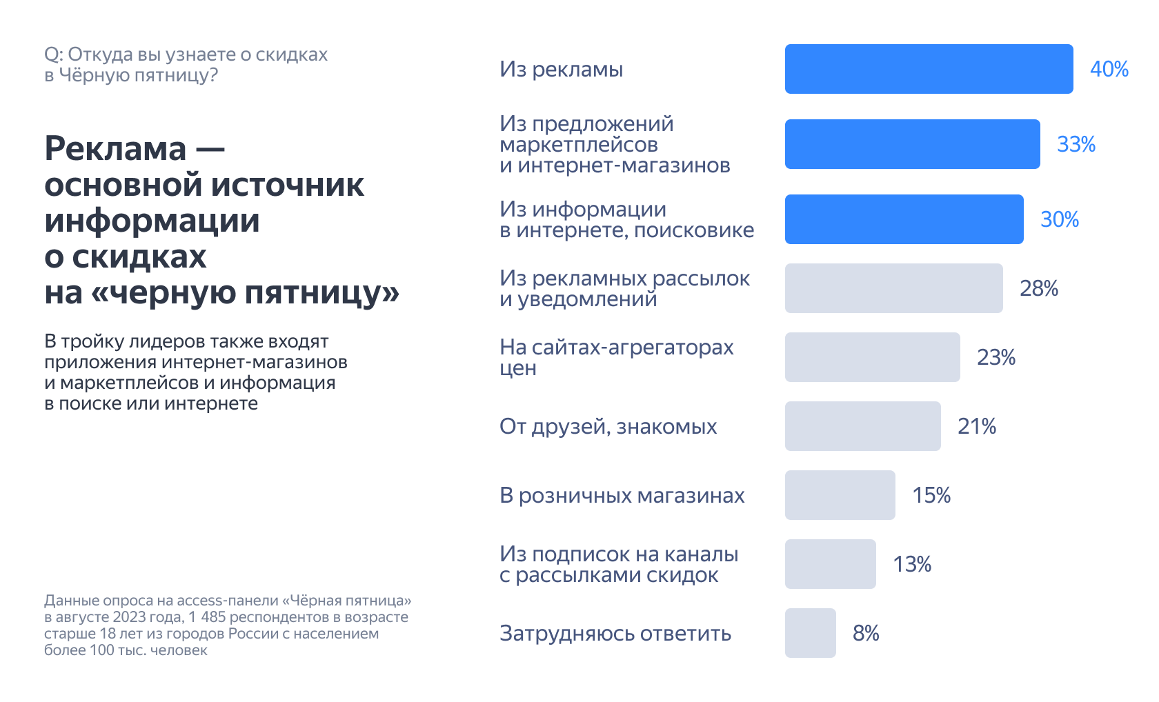 Главный источник информации о «черной пятнице» – реклама. Из нее о скидках, специальных предложениях и условиях узнают 40% опрошенных. Напрямую от продавцов, маркетплейсов и интернет-магазинов о предстоящей распродаже узнают 33%. Третий по значимости (30% респондентов) канал информирования – информация в интернете и поисковики.