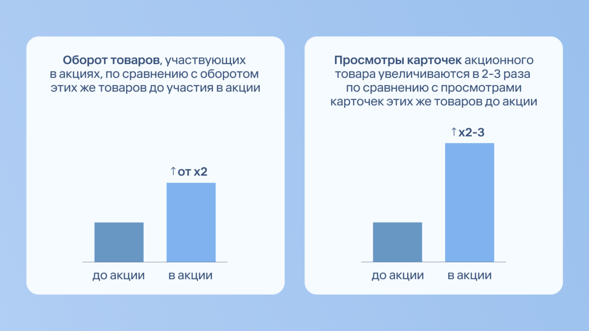 поднимают выше остальных товаров в поиске и дают дополнительный буст продаж. В среднем он в два–четыре раза больше, чем у товаров, которые не участвуют в акциях;