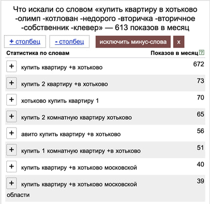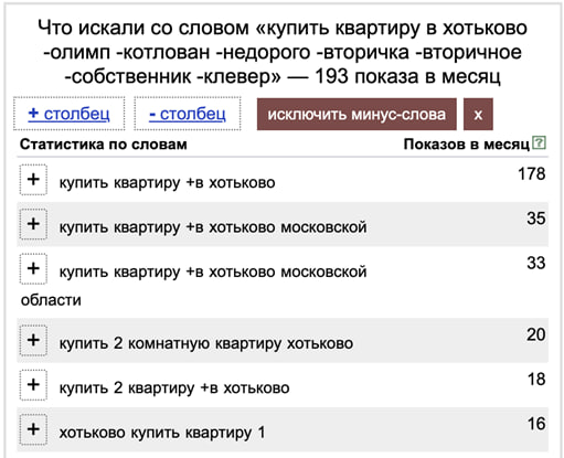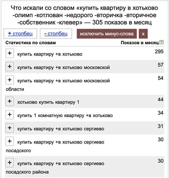 Сюда входят такие запросы, как «купить квартиру в хотьково — олимп — котлован — недорого — вторичка — вторичное — собственник — клевер».