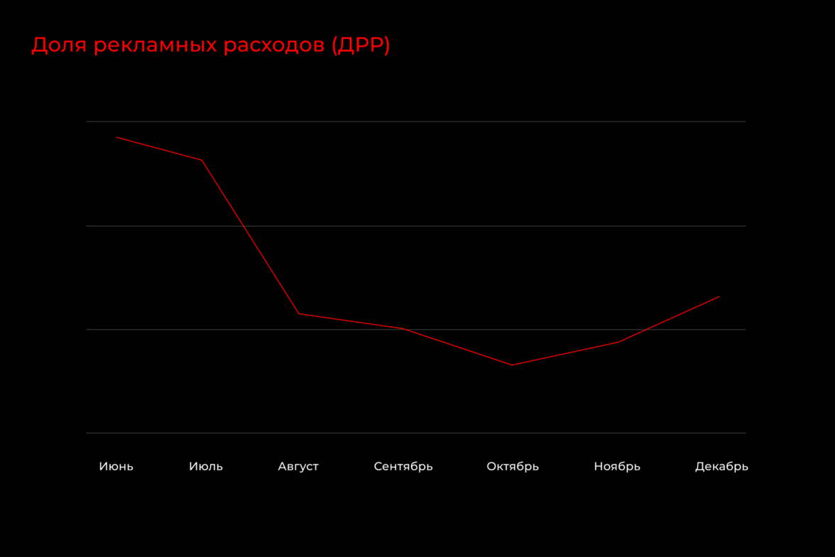 Общий ДРР по контекстной рекламе снизился в два раза с 4,6% в июле до 2,23% в среднем за период август–декабрь (без октября), а стоимость сделки (CPO) относительно июля снизилась на 63%.