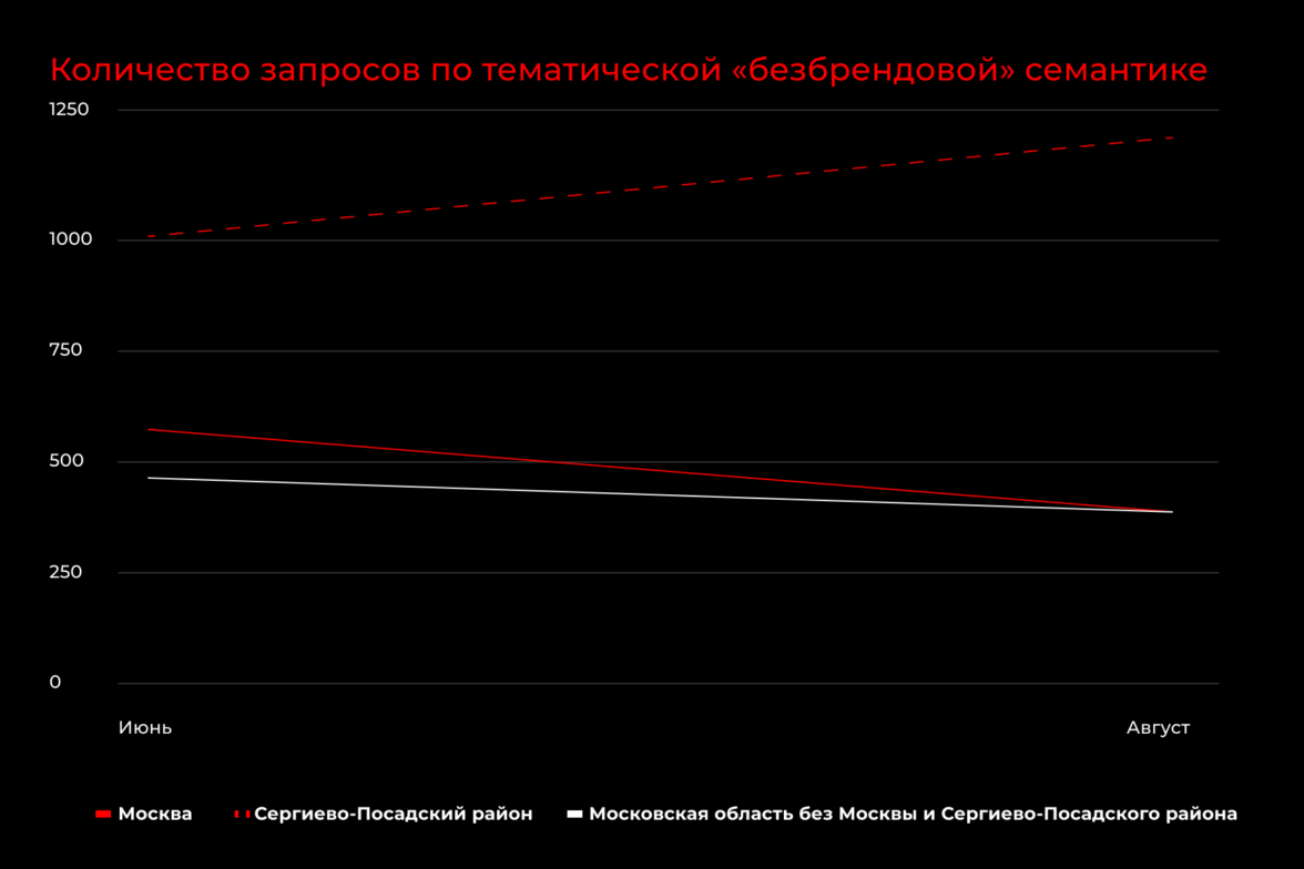 В Московской области (исключая Москву и Сергиево-Посадский район) брендовый трафик в два раза выше, чем в Сергиево-Посадского районе. Это составляет 55% от общего количества брендовых запросов по трем гео.