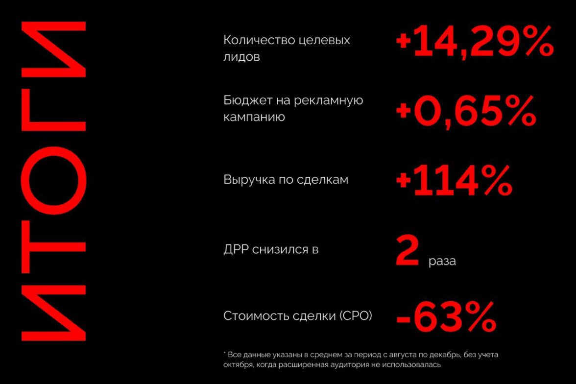 Расширение географии потребовало небольшого увеличения бюджета, при этом принесло кратное увеличение выручки. Полученные результаты доказывают, что в любой рекламной кампании необходимо подбирать и тестировать гипотезы для повышения эффективности показателей. Также важно отслеживать всю воронку до сделок и оценивать кампанию с точки зрения не только квалифицированных лидов, но и количества сделок, их стоимости, объема выручки по ним и доли рекламных расходов в обороте по сделкам (ДРР).