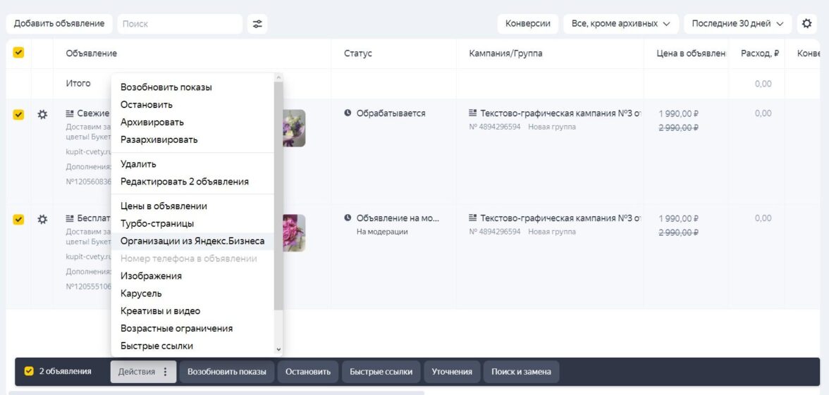 Совет. При большом количестве объявлений вы можете не тратить время на сортировку текстово-графических и медийных объявлений. Карточка организации будет подключена только к текстово-графической рекламе. Медийные объявления останутся без изменений.