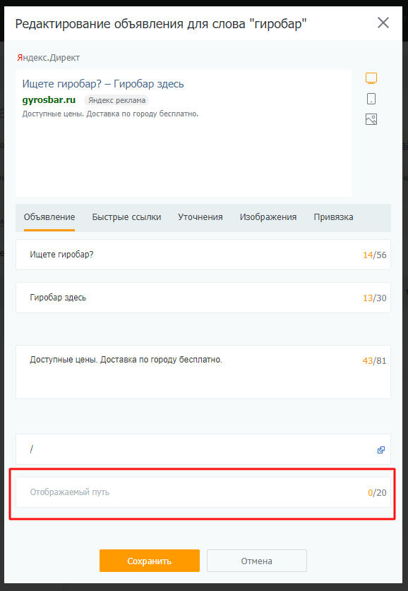 Важно! В кампаниях с динамическими объявлениями отображаемая ссылка создается автоматически, ее текст нельзя изменить или удалить.
