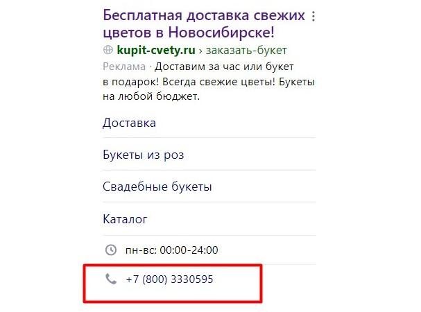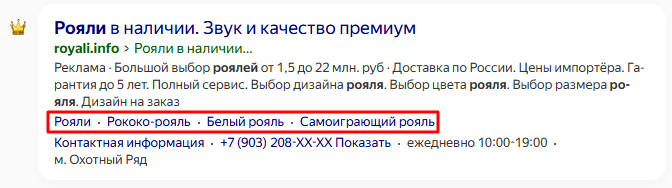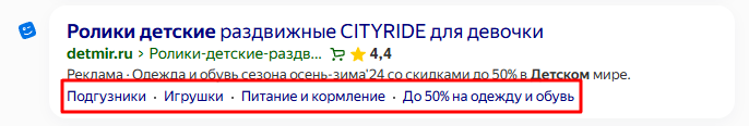 а в это объявление рекламодатель добавил только быстрые ссылки: