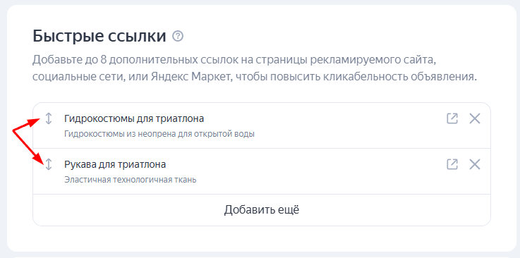 Нажмите на «Добавить», заполните необходимые поля и сохраните изменения. Максимально возможное количество быстрых ссылок в объявлении — 8.