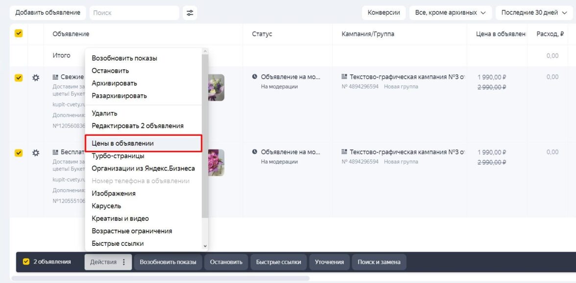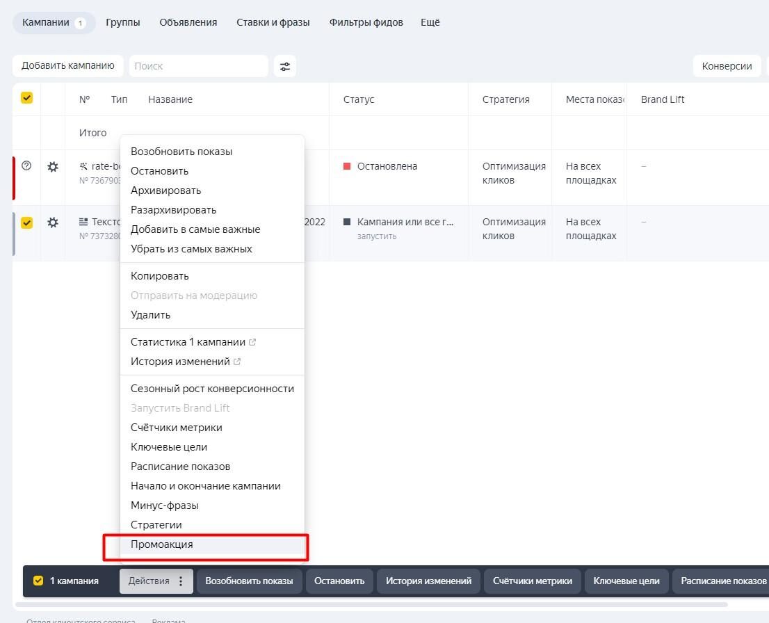 С помощью инструмента массового управления вы можете изменять и добавлять акции сразу для нескольких кампаний. Для этого отметьте нужные кампании и выберите пункт «Промоакция» в меню действий.